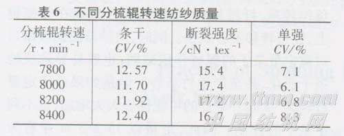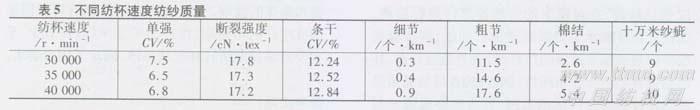 在其他工艺条件不变的情况下,就纺杯速度与质量的关系我们做了大量试验,结果见表5。