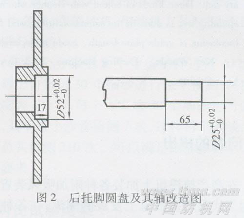 首先,我们把盖板前、中托脚圆盘由含油轴衬改为106滚动轴承,每个圆盘中2只,托脚根据相应尺寸和圆盘配套(见图1);其次,我们把盖板后托脚圆盘由含油轴衬改为205滚动轴承,每个圆盘中1只,后圆盘轴也根据相应尺寸和圆盘配套(见图2)。