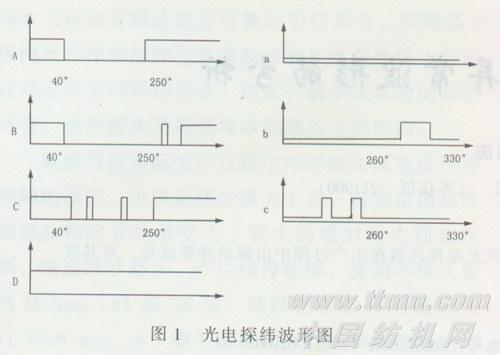 图1b:为发现长纬(断纬)时的长纬光电管波形。在260°之后,检测纬纱和较大的飞絮时,长纬光电管的发射、接收镜面存在光信号差,表现为低电位(与短纬光电管相反)。