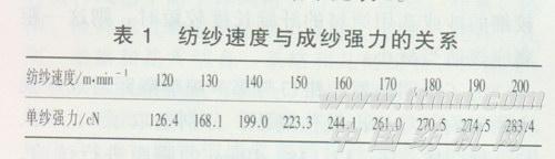 为了说明纺纱速度对成纱强力的影响,本文设计并做了如下试验。分别选取纺纱速度为120、130、140、150、160、170、180、190、200m/min进行实验。其它的参数:第一喷嘴内径为2mm,喷孔直径为0.4mm,孔数为4个,喷孔角度为45°;第二喷嘴内径入口内径为2mm,出口内径为4mm,喷孔直径为0.3mm,孔数为8个,喷孔角度为90°;开纤管长度为8mm,槽数为4个,槽深为0.8mm;第一喷嘴气压为0.3MPa,第二喷嘴气压为0.45MPa;纺纱速度为180m/min;所纺纱为18tex涤/棉(70/30)纱。实验结果见表1。