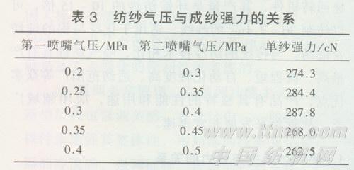 阐述了纺纱速度、前罗拉钳口与第一喷嘴隔距、纺纱气压等三个工艺参数对喷气纱强力的影响,并通过实验找出了较优的参数。