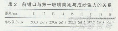 为了说明前罗拉钳口与第一喷嘴隔距对成纱强力的影响,寻找出最佳隔距,分别选取了11、12、13、14、15、16、17、18、19mm的隔距进行试验,纺纱速度为180m/min。其他的参数同纺纱速度的试验,实验结果见表2。