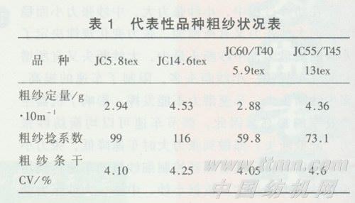 投产以来,先后在DTM129细纱机上生产过十多个品种,代表性的品种有:JC5.8tex、JC14.6tex、JC60/T40 5.9tex、JC55/T45 13tex等,半制品粗纱状况如表1所示。