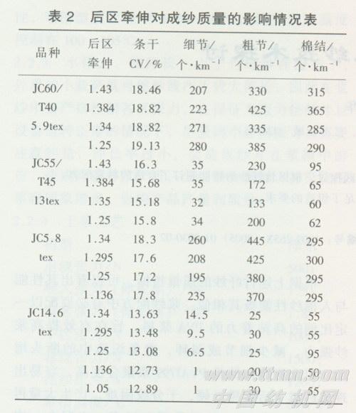 细纱后区牵伸的选择,要结合粗纱状况和细纱其他工艺参数选择情况来选定,DTM129细纱机后区牵伸大小对成纱质量的影响情况如表2所示。表中所有数据来自于同粗纱、细纱同锭、其他工艺参数相同,不同细纱后区牵伸条件下纺纱,十只管纱测试的平均值。
