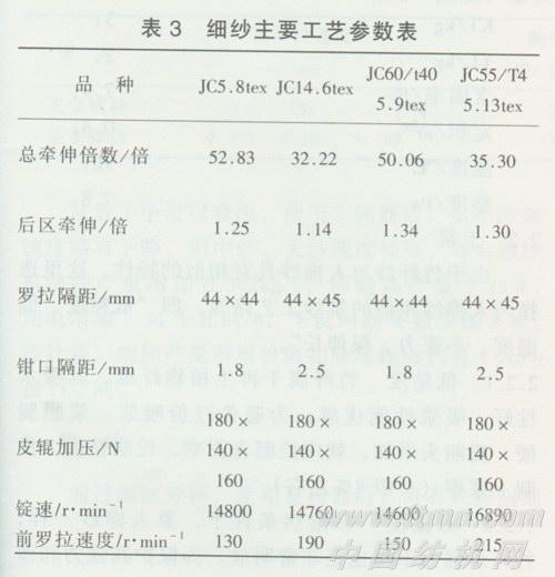 细纱工艺参数遵循重加压、较大的粗纱捻系数、较小的后区牵伸、适当的皮圈钳口隔距、前后区中心距配置适当的原则,在组织工艺设计时,对主要品种均进行了四因素三水平正交试验,找出最佳工艺组合推广使用,主要工艺参数如表3所示。