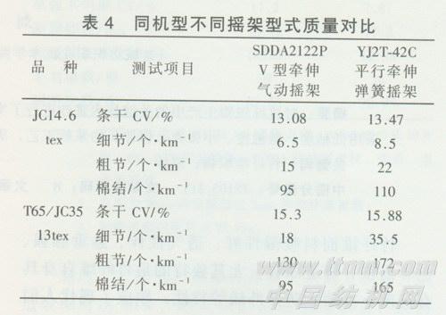 同品种十只粗纱在配置不同摇架的DTM129细纱机上,纺JCl4.6tex和T65/JC3513tex,质量对比情况如表4所示。