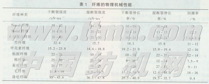 将Tencel纤维、Modal纤维、大豆蛋白纤维、竹纤维及粘胶基甲壳素纤维与粘胶纤维、棉、蚕丝、羊毛、涤纶纤维的物理机械性能进行对比,见表1。
