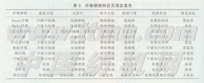 3.2燃烧法 燃烧法是根据纤维燃烧时和燃烧后的特征来区分纤维种类,试验结果见表3。