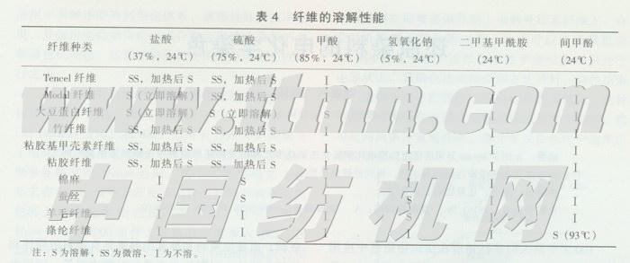 3.4溶解法 溶解法是根据纤维在不同的化学溶剂中、不同温度下的溶解特性来确定纤维品种,试验结果见表4。