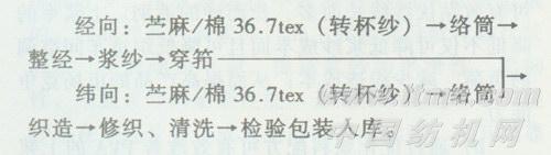 在现代高档纺织品生产过程中,除对纱线内在品质和外观质量指标有高标准外,还要求布面效果要好,特别是光洁、匀整、棉结疵点等外观要求。因此,作为麻纺织企业的技术改造和技术进步,应在追求技术经济的条件下,满足不断提升的纱线和织物的品质要求。近年来,随着国产新型转杯纺纱机的技术进步,装备的设计和制造水平均有了较大提高。转杯纺纱机自身有排杂装置,除杂效能高,同时,转杯纱的外表包缠纤维多,纱芯捻度大,承受的摩擦力也较大,因此,转杯纱比传统的环锭纱耐磨,手感也比较丰满。为了适应市场的需要,根据客户提供的样布进行分析,采用苎麻/棉转杯纱,不失时机地开发了苎麻/棉混纺本色小方格布,其规格为:苎麻/棉(R55/C45)36.7/36.7tex 334.5×197根/10cm 160/cm,在小样试验基础上,进行了大批量生产,满足了客户的要求。