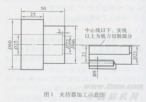 (2)采用45″钢车制一对空心半圆筒柱形的罗拉头夹持器(见图1),夹持器下部3 mm厚的凸缘刚好能钩住罗拉头颈部与轴承壳体间的空隙,紧密地夹持罗拉头。上部圆柱筒边缘打孔,改M8螺孔。