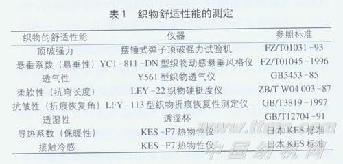 织物被测试的舒适性能指标、测试仪器及参照标准见表1。