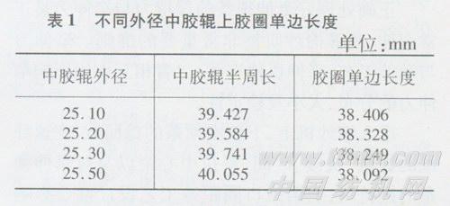 上胶圈在中胶辊上面的两个切点至上销前钳口前沿的距离称胶圈单边长度。近似计算胶圈单边长度为:(上胶圈内周长一中胶辊半周长)÷2。不同外径中胶辊状态下胶圈单边长度见表1。
