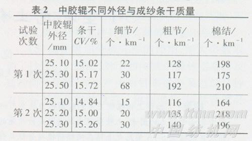 在FA507型细纱机(配YJ2-142A型摇架),纺CJ 9.8 tex品种,在同锭同粗纱条件下进行不同直径中胶辊纺纱试验,每次各试纺30锭,其试验结果见表2。