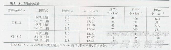 (1)S-1型尼龙上销比原用钢质上销能降低条干CV值,C 18.2 tex品种降低0.5~0.8个百分点,CJ 18.2 tex品种降低0.2个百分点,且降低细节效果明显。