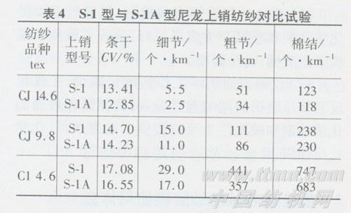 (2)S-1A型尼龙上销在S-1型尼龙上销基础上进行了优化改进,除改善条干外,又可进一步降低毛羽数15%~27%。