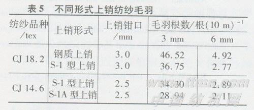 将原用钢质上销、S-1型尼龙上销与S-1A型尼龙上销进行纺纱毛羽对比,结果见表5。