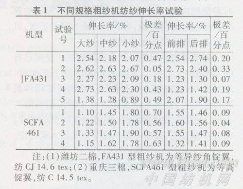 棉纺粗纱机筒管前后配置,相应的锭翼亦为前后排配置。由于自前罗拉输出的须条纵向位于一条直线上,被引向锭翼入口时,若为等高锭翼便形成前排导纱角小,后排导纱角大,在捻度作用下前罗拉钳口处形成的无捻三角区后排粗纱较前排粗纱大。无捻三角区处易发生意外伸长,为了使前后排粗纱伸长差异减小,便把后排锭翼的上部抬高,形成前排低后排高,使其导纱角一致的等导纱角锭翼。采用三罗拉牵伸机构的粗纱机,等导纱角锭翼使用效果较显著,因为三罗拉牵伸机构的主牵伸区不允许采用较小的集合器,否则粗纱条干恶化,此时,输出的粗纱须条较宽(一般达8mm-10 mm),前罗拉钳口处无捻三角区长度较长,前后排差异大,造成前后排粗纱伸长差异增大。但是现代新型棉纺粗纱机大多采用四罗拉牵伸机构,在主牵伸区前增加有集束区,集束区内采用了较小的集合器,不影响粗纱条干,此时,输出的粗纱须条宽度仅5 mm左右,使用高效假捻器后使无捻三角区缩短到10 mm以内,使用等高锭翼前后排差异也不大,因此采用等导纱角锭翼的效果就不明显。表1分别为两钟规格粗纱机试验数据,均为四罗拉牵伸,但一种是等高锭翼,另一种为等导纱角锭翼,试验数据表明,两者的效果相近(不同工厂伸长率试验有差异,仅供参考)。