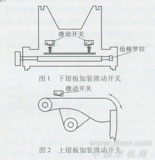 我们进行原因分析后,于2002年3月,在上下钳板加装了微动开关,如图1、图2所示,此微动开关与主机的自动系统相接。给棉罗拉绕花自停的微动开关装在下钳板上,罗拉绕花时压住微动开关而停机;上钳板忘记复位不能开机的微动开关装在中墙板上,忘记复位时上钳板结合件压住微动开关而不能开机,钳板正确复位后才能开机。