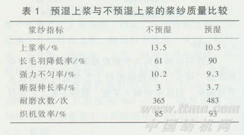 浆前预湿就是在经轴架与浆槽之间装上一预湿装置,经纱在进入浆槽浸浆前,先经过预湿装置高温(一般采用85℃以上的水)预湿,再经过一对挤压辊(85~90kN)来控制经纱的回潮(30%左右)和软化贴伏毛羽。笔者对纯苎麻织物幅宽为160cm、经纬纱线密度为28tex、经纬纱密度为276根/10cm×220根/10cm进行预湿上浆实验,其浆纱质量与不预湿浆纱比较如表1。