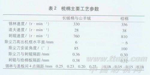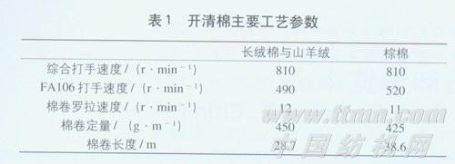 由于棕棉纤维细度较小,成熟度较差,因此在开清棉加工时采用了柔和开松,多松少打、降低落棉、轻定量的工艺原则.主要是为了少伤纤维。同时,在后道加工中要经过精梳,落棉工艺亦要适中掌握,因此在本工序中打手速度均偏低掌握.合理控制落棉工艺。而对于长绒棉与山羊绒纤维在加工中采用了“少打多松、精细抓棉、少落杂质”的工艺原则,加强混合效果,同时考虑打手返花造成棉结过多的因素,在安排工艺流程时.尽量减少单机数量.适当减少打击点,这样在保证开松混合效果的同时,减少了返花现象与纤维的损伤。在上包时采取了横向交叉、纵向错开、削高填平等措施。主要工艺参数见表1。