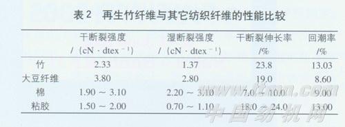 由表2可以看出.再生竹纤维具有较高的干、湿断裂强度.再生竹纤维的干断裂伸长率和回潮率最高。