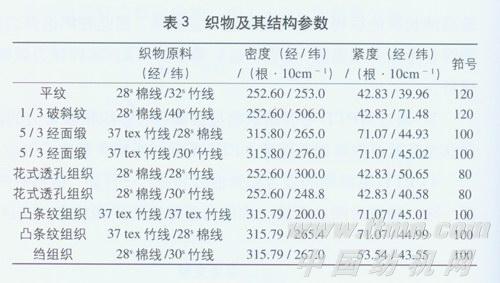 实验中主要针对再生竹纤维纱纯织、再生竹纤维与棉纤维交织及再生竹纤维与竹/棉混纺纱交织进行了织物组织结构和各项参数的设计。所有织物均是用ASL2000-D剑杆织机织造而成。表3所示为相应设计的9种组织,以及相应的结构参数。