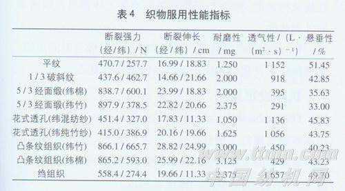 综合分析后得出.紧度较小的花式透孔组织.其透气、悬垂性能均较好,织物耐磨,而且花型美观.最适合制作夏季服饰面料。绉组织以其突出的透气和悬垂性能,也是夏季面料很好的选择。紧度较大的1/3破斜纹组织,由高支高密纯竹纱作纬,透气性能突出.悬垂性、耐磨性及机械耐久性均较好.适合做春夏季服装,如高档女士套裙、职业女装等等。而凸条纹组织优良的透气、悬垂性能,及美观大方的竖条效应,使其成为春装的优选面料。此外,以低支竹纱线为经纱的经面缎纹组织织物.服用性能优良,更适合于春季西装、制服等对面料挺括性能要求很高的服装制作。