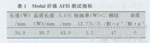 Modal纤维(1.0 dtex×39 mm)AFIS测试指标如表1所示。