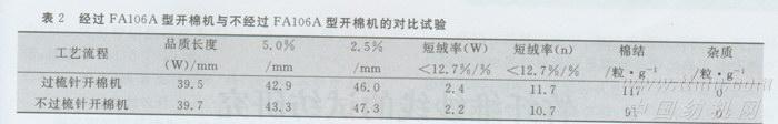 (2)尝试缩短工艺流程,按上述工艺流程,做过FA106A型梳针开棉机与不过FA106A型梳针开棉机的不同工艺流程的对比试验,结果如表2。