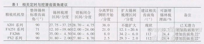 金属整体锡林已替代植针锡林,前者具有锯齿密度大、梳理强、少嵌短纤尘杂、棉网质量好、运转和维修省工省时、寿命长达数年等优点;锯齿锡林可根据定时潜力,便于增加齿面角,有4分割~6分割,总齿数可达2万枚~2.5万枚,比植针锡林多一倍以上。扩大齿面角的先决条件是不可影响分离接合,同时保持钳板闭合状态和分离罗拉倒转前纤维受梳。挖掘梳理分度区间潜力,要兼顾相关运动配合并防止接针,如表1所示。