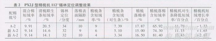 PX2系列锡林齿面角标准配备90°,梳理区间31.8分度~2分度有10.2个分度。考虑钳板全闭区间27.8分度~8.7分度,分离罗拉倒转开始2.5分度,可扩大齿面角到112°,梳理工作区间应在29.3分度~2分度,占12.7个分度,梳理开始提前2.5个分度,增加锡林梳理面24.4%,锡林定位相应提前2个分度是合理的。新机出厂112°锯齿锡林未调整锡林定位,梳理工作区为31.8分度~4.5分度,已超越分离罗拉倒转定时2.5个分度,末排针通过后分离罗拉最近点时,有带走倒人上次分离纤维之弊,致精梳条棉结数增多、含短绒率变大;经调整12台锡林定位提前2个分度到32分度已达预期效果,如表2如示。