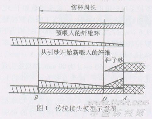 图1为传统接头模型示意图,按照这样的接头工艺,接头段实际上分为三段:(1)种子纱;(2)预喂人的纤维环;(3)引纱开始后新喂人的纤维。其接头长度要大于一个纺杯的周长,而且一次接头会形成明显的两个粗节,一个粗节在种子纱头A处,另一个出现在B点处,A点和B点的距离为一个纺杯周长。对于这个模型,有人研究过其接头工艺,就是种子纱伸人杯中的接触长度L为纺杯周长的1/3,预喂入量是正常纱线纤维量的2/3时,其强力和外形都处于较佳的情形。不过即使如此,粗节还是正常纱线的1.6倍。