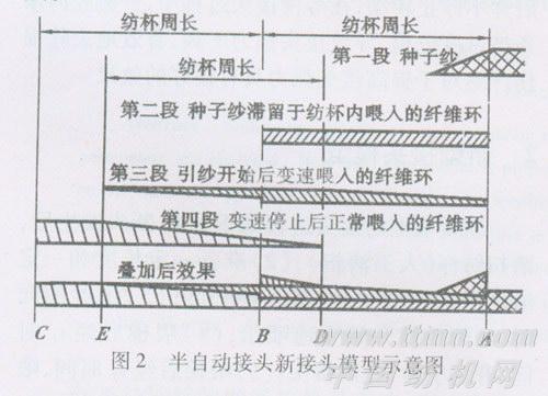 第三段是引纱时新喂人的纤维环。如果不改变喂入罗拉的速度,则由于剥取运动的进行,会形成如第四段那样明显由细到粗的纤维环,相应地,在接头第一个纺杯周长内会出现一个明显的粗细变化的外观。为了避免形成这种接头,这一过程实行匀减速喂入,使得变化曲线变得缓和,如AD过程所示。图2中,减速过程在剥取点到达D处就结束了,恢复到了正常纺纱的速度。由于极短的时间内通过通道而达到纺杯凝聚槽的纤维会均匀分布在整个纺杯圆周上,所以当剥取点到达D处时,纺杯内还存余一个纤维环DE,这一纤维环仍然是变速过程形成的。由于第三段速度和时间的控制,形成的纤维环要比正常喂入均匀得多,相应地,接头的效果也随之有所改进。