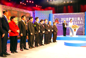 在颁奖晚会上,邱董还作为颁奖嘉宾向001集团老总项青松颁发了“首届浙江商人年度风云人物”提名奖。