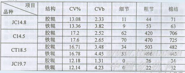 经制后中上罗拉轴承胶辊替代铁辊,经我们试用测试对比后,从表中数据中可以看到,其成纱质量主要指标CV值与CVb值均有所改善。