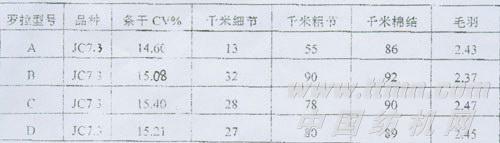 确的沟槽齿形和表面光洁度。以上都是静态的要求,而纺纱时罗拉是在180转/分钟左右的速度下运转的,因此整根罗拉要保证在高速下径向跳动极小,罗拉沟槽既能充分握持纤维又不能损伤纤维,国内外罗拉制造商也在这些方面进行了大量研究,生产出多种不同类型的罗拉,我公司也对这些不同型号的罗拉进行了同锭、同粗纱、同工艺条件下的纺纱试验,试验结果如下表1: