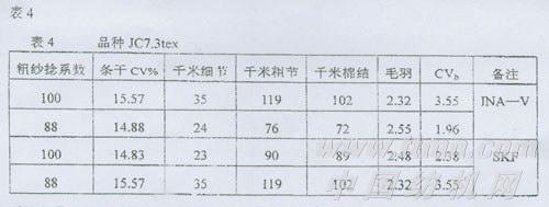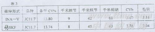 3、 牵伸形式。V型牵伸和SKF牵伸是目前细纱使用最广的两种牵伸,INA-V型牵伸采用下罗拉抬高,后皮辊后摆,前皮辊前冲的方式,增大须条与罗拉的包围弧,增加对边沿纤维的控制。仿SKF牵伸是一种直线牵伸,其加压稳定,结构合理。在同一台细纱机上,我们进行了同锭、同粗纱、不同工艺参数的试验,成纱质量见下表3: