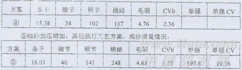 力界。粗纱的捻度小,会造成粗纱脱断,意外牵伸使成纱条干恶化;捻度过大,会造成细纱牵伸时牵伸力过大,牵伸不开出硬头。因此,粗纱捻系数的选择是非常重要的。我们对同机型、不同牵伸形式的细纱机的适应性进行了试验,试验结果见表4