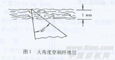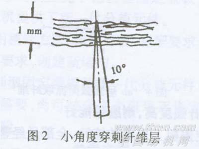 针尖角的大小决定了穿刺分离纤维作用的强弱,它比大角度齿尖容易顺利刺人棉层,且不易损伤纤维(见图1、2)。因而梳理质量也就越好。经比照,锯齿型固定盖板齿尖角一般都在35°~45°范围内选用,而当改用针刺梳理时,针尖角可使用10°以内,这就是针刺分梳优于锯齿分梳的最根本原因,假如锯齿齿尖角也选用10度内,它将失去刚度,缩短寿命。