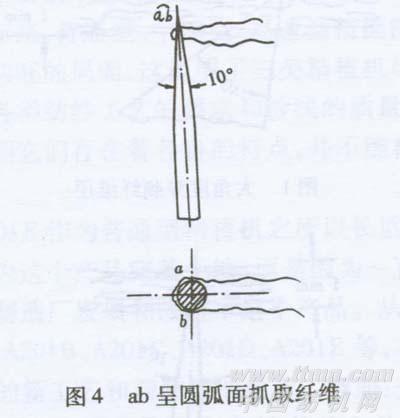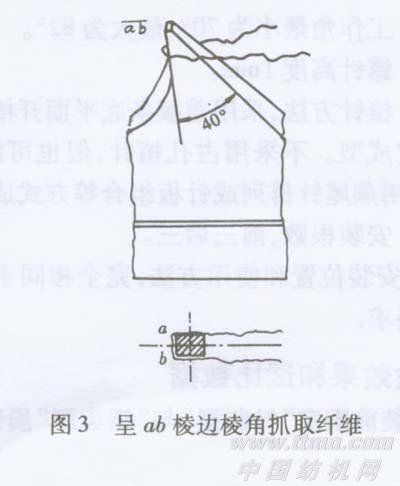 由于锯齿型尖端截面始终呈矩形状,因而它必然有棱边棱角的出现,如见图3、4所示,尤其是〈a和〈b两个棱角,纤维在接受高速锡林和固定盖板间的强烈梳理时,极易遭受〈a和〈b的切割性损伤,相反,针刺型梳针始终呈ab圆弧面抓取(见图4),纤维容易滑移,针尖本身也不存在切割性威胁,因而纤维损伤也少。经对比试验证实,生条短绒少,成纱强力高。