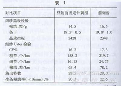 从表1两型质试对比表明,针刺型成纱条干均匀度明显优于锯齿型,CV下降1.1个百分点,粗节减少28%,细节减少35%,由于梳理作用细致,乌氏棉结减少16.4%,又由于生条短绒率减少2.3个百分点,成纱强力增加,品质指标提高80分。从表1试比表明,完全达到了预期设计效果。