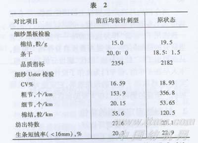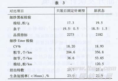 从表2质试表明,其质量改善规律不仅与表1相同,而且更有明显提高,成纱条干均匀,CV值下降2.3个百分点,这是非凡的收获,粗节减少56.9%,细节减少62.4%,由于前后针刺作用充分和细致,所以乌氏棉结也减少了53.9%,由于短绒减少成纱强力增加,所以品质指标提高172分,实效明显,这是针刺分梳优越的最大综合体现。
