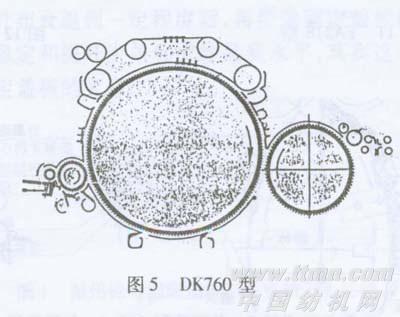 (3)回转盖板减少至84根(工作区30根),无抄针门,配置后11前3(或后11前4)带前后各1棉网清洁器固定盖板。特点是去除棉结杂质和短绒率最高,改善生条和成纱品质最显著。回转盖板减少22根后,同样速度下回转盖板的清洁周期缩短了