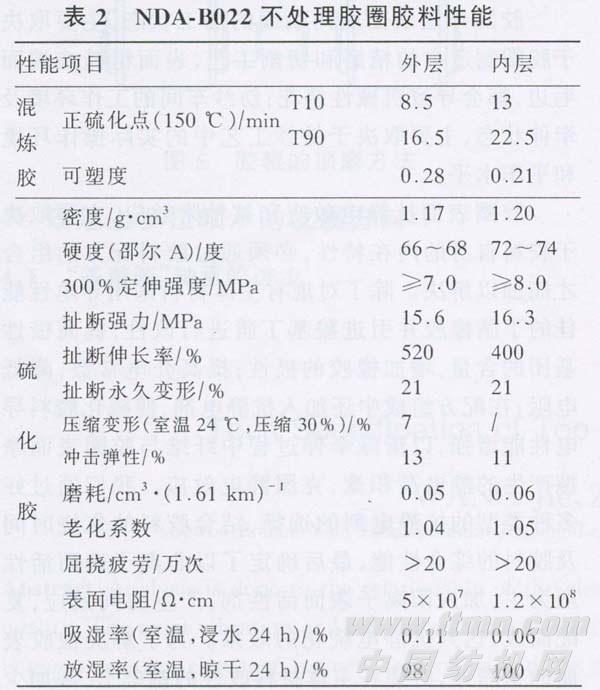 4.3 B022胶圈生产过程中,外层磨砺后即可切割,无需表面处理,简化了工艺,改善了劳动条件,缩短了生产周期。同时,防止了胶圈因表面处理造成橡胶分子链断裂的人为老化,保持橡胶固有的特性,如:硬度、弹性、表面柔软性等;可获得纺纱的最佳效果,并可延长胶圈的使用寿命。