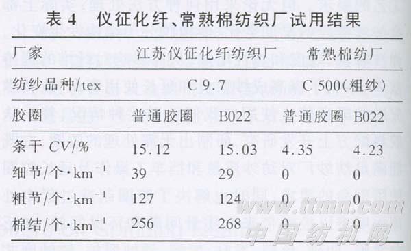 4.2 在同等条件下使用,与进口胶圈成纱质量相当,达到了美国阿姆斯壮公司胶圈的使用水平,而成本价仅为进口的l/8。