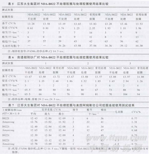 NDA-B022不处理胶圈先后经仪征化纤、常熟棉纺厂、江苏大生集团,南通朝阳纱厂使用,与国内常用的普通胶圈以及处理的B022胶圈数据进行对比(测试结果见表4~表6)。其条干CV值及平均毛羽个数都有明显下降,粗、细节也有改善。江苏大生集团在FA506细纱机纺Cj 14.5 tex纯棉寸连续使用并与进口美国阿姆斯壮公司胶圈进行了全面测试比较(结果见表7)。条干CV值和细节都有较大改善,单锭条干CV值极差小(0.53%~0.77%)。其它性能都在同一水平上,达到乌斯特公报5%的水平。