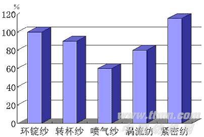 经试验得知,如以环锭纱强力为1,那么其它种类纱线的强力为:转杯纱0.8 ~ 0.9,喷气纱0.6 ~ 0.7,涡流纱0.8,紧密纺纱强力最高为1.15。图2直观地反映了不同纱线的强力对比情况。