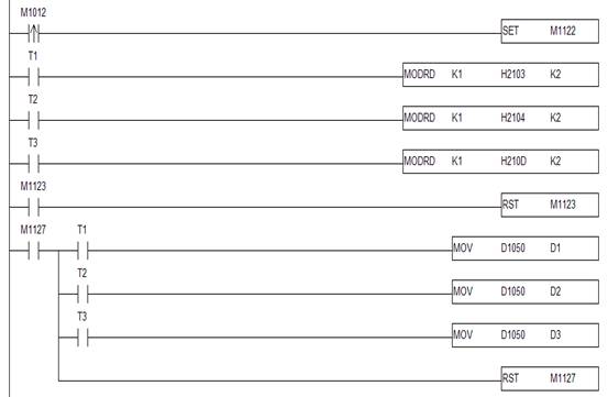 假设在触摸屏上显示频率、电流、温度的寄存器地址分别是D1、D2和D3,刷新的时间是7个单位时间,先利用PLC编程软件形成一个如下图所示的循环时间脉冲,当然编制这个程序也有不同的方法,这里就不详细叙述了。可以用T1、T2和T3分别来触发“MODRD”指令,从而在不同的时间送出所需要的资料。