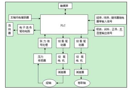 剑杆织机完成经、纬纱线的交织需由提棕、引纬、打纬、送经、卷取等五大运动的有机配合以及其他辅助运动的配合,才能得以完成。另外还有断经自停、缺纬自停、纬纱补给(换梭)等由辅助机构控制的辅助运动。整个运行过程控制复杂,既要实现织机启动、停车、经停、纬停及自动寻纬等基本功能,同时系统又由送经电机、卷取电机、减速系统、伺服控制器、张力传感器及相关机构通过伺服控制器分别调节送经电机和卷取电机的转速,以维持织物所要求的纬密,并保证张力恒定。下图是剑杆织机控制系统框图
